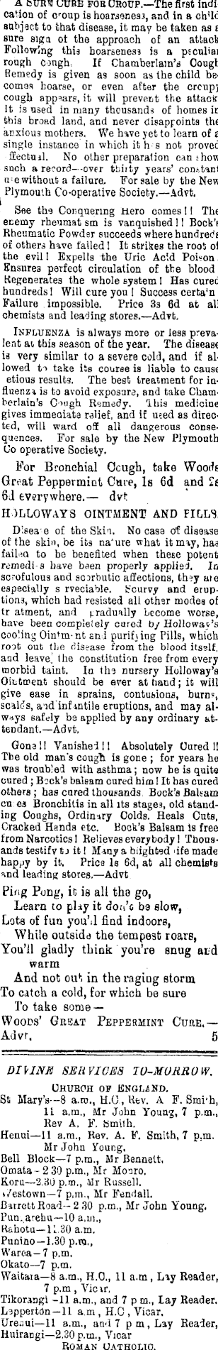 A Suns CUBE FOB OHotJP.—The first indication of coup is hoarseness, and in a ch'ld subject to that disease, it may be taken as a sura siga ot the approach of an attack Following this hoarseness ia a peculiar rough Cough, If Chamberlain's Cough Remedy is given as soon as the child becomas hoarse, or even after the crcupy cougb appears, it will prevent the attach. It is used in many thousands of homes in this broad land, and never disappoints the anxious mothers. We hive yet to learn of a single instance in which it h- s not proved Sectuil. No other preparation can show such a record—-over tbiity years' constant u ; e without a failure. For sale by tbe New Plymouth Co-operative Society.—Advt. See the Conquering llero comes 11 The enemy rheumat sm is vanquished ! 1 Bock'B Rheumatic Powdar succeeds where hundreds of others have failed 1 It strikes the root of the evil 1 Expells the Uric Acid Poison i Ensures paTfeot circulation of the blood; Kegenerates the whole system I Has cured hundreds 1 Will cure you 1 Success certa'n I Failure impossible. Price 3s 6d at all chemists and leading stores.—Advt. Influenza is always more or less prevalent ai this season of the year. The disease is very similar to a severe cold, and if allowed ti take its course is liable to causa etious results. The best treatment for influenzi is to avoid exposure, and take Chamberlain's C'XJgh Remedy. Ihis medicine gives immeaiata relief, and if used as directed, will ward off all dangerous consequences. For sale by the New Plymouth Co operative Society, For Bronchial Ccugh, take Woods Great Peppermint Cure, Is 6d and 2s 6d everywhere.— dvt HOLLO WAYS OINTMENT AND FILLS. Disea e of the Skin. No casa of disease of the skin, be its na'ure what it may, has failrfQ to be benefited when these potent remedi-s have baen properly applied. In scrofulous and scorbutic affections, th?y aie especially s rveciable. Scurvy and eruptions, which had resisted all othsr modes of tr atment, and gradually become worse, have been completely cured b/ Hollowas's cooling Ointm-nt sn i purifjing Pills, which root out the nisease from the blood itsslf, aad leave! the constitution free from every morbid taint. In tli3 nursery Holloway's OiLtment should be ever at hand; it will give ease in sprains, contusions, burn?, scalds, aid'inf intile eruptions, and may always safely be applied by any ordinary attendant.—Advt, Gone II Vanished 11 Absolutely Cured 11 Tbe old man's cough is gone ; for years he was troubled with asthma; now be is quite cured ; Back's balsam cured him I It ha 9 cured others; has cared thousands Bock's Balsam cues Bronchitis in all its stages, old standing Coughs, Ordinary Colds. Heals Cuts, Cracked Hands etc. Bock's Balsam is free from Narcotics I Relieves everybody 1 Thousands testify tj it 1 Many a blighted <ife made happy by it. Price Is 6d, at all chemists *nd leading stores.—Advt Ping Pong, it is all the go, Learn to play it do.-i'c be slow, Lota of fun youM find indoors, While outside the tempest roars, You'll gladly think you're snug aid warm And not out in the raging storm To catch a cold, for which be sure To take some Woods' Great Peppermint Cure.— Advt. 5 DIVINE SERVICES TO-MORROW, Church of kngi.and. St Mary's—B a.m., H.O, Utv. A F. Smi'h, 1L a.m., Mr John Young, 7 p.m., Rev A. F. Smith. Henui—ll a.m., Rev. A. F. Smith, 7 p.m. Mr John Joung, Bell Block—7 p.m., Mr Bennett, Omata- 2 30 p.m., Mr Monro. Kortt—2.3ij p.m., Mr Russell. >/estown—7 p.m., Mr Fendall. Barrett Road— 2 30 p.m., Mr John Young. Pun, arehu—lo a.m., Rahotu—K.3o a.m. Punino—l.3o p.m., Waroa—7 p.m, Okato—7 p.m. Waitaia—B a.m., H. 0., 11 a.m, Liy Reader, 7 p.m, Vicir. Tikorangi -11 a.m., and 7 p m., lay Reader. Lsppertdn—ll a.m, H.C , Vicar. Ureaui—ll a.m., and 7 pm,Lay Reader, Huirangi—2.3o p.m., Vicar Roman Uathoi.to.