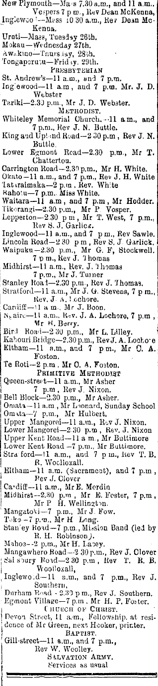 New Plymouth—Ma-s 7.30 a.m., and 11 a.m.. Ve-pers 7 pm., Rev Dean McKenna, JnglewooMfss 10 30 a.m., Kev Dean MoKenna. Urati—Mass, Tuesday 266 h. Mokau—Wednesday 27th. Aw.-.kino—Tnurs.iay, 28ib. Tongaporu'.u—Fridiy. 291 h. PItKSBVTEHIAN St. Andrew's—ll a.m., a 111 7 p.m. Ing!ewood—ll a.m, and 1 p.m. Mr. J. D. Webster Tariki—2.3J p.m., Mr J. D. Webster. Mkthodist. Whiteley Memorial Church.--11 a.m., and 7 p.m., Kev J. N. Buttle. King aud Upl-.nd Road—2 30 p.m, Rev J. N. Buttle. Lower E;;mont Read—2.3o p.m., Mr T. (Jhat.tert.ou. Carrington Road—2.3D p.m., Mr H. White. Okato—ll a.m., and 7 p.m., Re» J. H. White latiraimaka—2 p.tn , Rev. White Hahotu—7 p.m. Miss White. Waitara—ll a.m, and 7 p.m, Mi Hodder. Tikorangi—2.3o p.m., Mr P Vosper. Lepperton—2.3o p m , Mr T. West, 7 p.m.. Rev 8. J. Garlic*. Inglewood—ll a.m., and 7 pm„ Rev Sawle. Lincoln Road—2 30 pm , Rev S. J Uarlick. Waipuku—2.3o p.m., Mr G. F, Stockwell. 7 p m., Kev J. 'J horoas Midhirst—ll a.m., Rev, J. 'lhomas 7 p.m., Mr J. Turner Stanley H0a1—2.30 p.m., Rev J. Thomas. Stratford—ll a.m., Mr J. G\ Stevens, 7 p m., Rev. J a. J.oehore. ; Cardiff—<l a m., Mr J. Boon. NLairc—ll a.m.. Kev. J. A. Lochore, 7 p.m , Wr H, Berry. Biri Road—2 30 p.m., Mr L. Lilley. Kahouri Bridge—2.3op.m., RevJ. A. LocKo'e Eltham—ll a.m., and 7 p m., Mr 0. A. Foston. Te Roti—2 p.ra , Mr 0. A. Fo3ton. PHIMITIVH METHODIST Queen-street—ll a.m., Mr Asher I 7 p.m , Rev J. Nixon. Bell 810ck—2.30 p.m., Mr Asher. Omati—ll a.m., Mr Leonard, Sunday School Omita—'/ p.m., Mr Hulbeit. Upper Mangarei—ll a.m., Rtv J. Nixon. LowerMangorei—2.3o p.m, Rev. J. Nixon Upper Kent Road—ll a m., Mr Buttimore Lower Kent Road—7 p.m., Mr Buttimore. Stra £ord—ll a.m., and 7 p m., Kev T. B, | R, Woclloxall, Eltham—ll a.m. (Sacrament), and 7 p.m, Pev J. Olover Ca'diff—ll a.m., MrE. Mordin Midhirst—2.3o p.m, Mr K. Foster, 7 p.m, Mr P H. Wellinajtm. ' Mangato'ii—7 p.m., Mr J. Fow. IVika— 7 p.-n., Mr H Long. Stan'ey Ko^d—7 p.m., Mission Band (led by R. H. Robinson J. Maho3--2 p.m., MrH. I.a'jey. Mangawhero Road—l 30 p.m., Rev J. Olover ic'aislury Hold—2 30 p.m, Rev T. R. B. | Wool'oiall, ( Inglewo.d—ll a.m., and 7 p.m., Rev J. ! Southern, Durham P.nad - 2.30 p m., Rev J. Southern. Kgmont Village—7 p.m . Mr H. P, Foster, i C huucfi OF CHUIST. (Devon Street, 11 a.m., Fellowship, at resij dence o£ Mr Green, next Hooker, printer. ! Baptist. ! Gill-street—ll a.m., and 7 p.m., Rev W. Wcolley. S 4.LVATION AEMY. j Services as usual