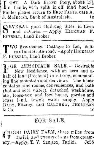 LOST —A Dark Brown Pony, aboat 13.', hande, wi'h split in off hind hooF.— ! Finder plea-e return to Kbic Kaius, caie A. 1 J. Molntjsh, Bank of Australasia. tc SEVERAL good Building Sites in town and suburbs. Apply Hickman F. | Russell, Land Broker TWO five-roomed Cottages to Let, BeltroidandS ,uth-road. -Apply Hickman | F. Russell, Land Broker. ; "I, OR IMMEDIATE SALE. Dosirable .Jj New Residence, wiih an acre and a--1 halt of land (freehold) in c itzroy, commandi ing fine mountain and sea views The house ' contains nine rooms, conveniences, and bath (hot and cold v.ater), dslacfced washhouse, etc , loose-liox and fowl house, garden and grass li<n-J, tewn'd water supply. Apply Baby, Fitzroy, and Cauthicvv, Thompson & (Jo, tc FOR S<U/FJ. rl OOD PA IKY FARM, three tr.iles from .T Tiitilii, and twerv.yc! .i;ns from cream-ery.--Aunly, T, Y. 51M91.-3, Tajiki.. Je2B