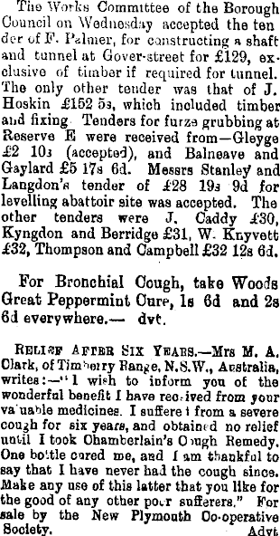 J.ne Works Committee of the Borough Council on Wednesday accepted the ten der of P. Palmer, for constructing a shaft and tunnel at Gover-street for £129, exclusive of timber if required for tunnel. The only other tender was that of J. Hoskin £ 152 53, which induded timber and fixing Tenders for furza grubbing at Reserve E were received from—Gleyge £2 10j (accepted), and Balneave and Gaylard £5 17s 6d. Messrs Stanley" and Langdon's tender of i'2B 19a 9d for levelling abattoir site was accepted. The other tenders were J. Caddy i'3o, Kyngdon and Berridge £3l, W. Knyvetfc £32, Thompson and Campbell £32 12s 6d. For Bronchial Cough, take Woods Great Peppermint Cure, Is 6d and 2s 6d everywhere.— dvt. Rbli»jt aiteb Six Ybabs.—Mrs M. A. Olark, of Hange, N.S.W., Australia, writes:—"l wish to inform you of the wonderful benefit I have reo.-ived from your va'uable medicines. I suffere 1 from a severe cough for six years, and obtained no relief until I took Chamberlain's 0 nigh Remedy. One bo'.tle cored me, aad 1 am thankful to say that I have never had the cough since. Make any use of this latter that you like for the good of any other poi.r sufferers." For sale by the New Plymouth 00-operative Society. Advt