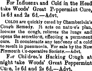 For Influenza and Gold in the Head tike Woods' Great Peppermint Cure, Is 6d ae>d 2s 6d.—A.dvfc. Colds are quickly cured by Ohambsrlain'a Couph Remedy. It acts on natu'e'n plan, loosens the cough, relieved the lungs and opens the secretions, effecting a permanent cure. It counteracts any tenc'enoy of a cold to result in pneumonia. For sale by the New Plymouth Co-operative Society.—Advt. Fur OhildreL'a Hackiog Oough at night take Woods' Great Peppermint Cute, Is 6d and 2s 6d.—Advt. .