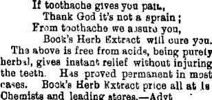 It toothache gives you paib, Thank God it's not a sprain; From toothache we ajsnto yon, Book's Herb Extract will cure yan. he above is free from acids, being purely herbil, gives instant relief without injuring the teeth. Has proved permanent in most rases. Book's Herb Kxtraot price all at Is Chemists and leading stores.—Advt