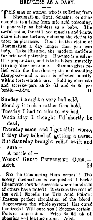 HELPLESS AS A BABY. THE man or womin who is aaffariD? from Rheumatism, Gout, Sciatica, or other complaiuts arising from uric acid poisoning, is generally as helpless ss a baby. The awful pai is, the ?tiff <ned muscles ami joints, cau'e intense torture, reducing the victim to utter helplessness. Don't he the victim of Rheumatism a day longer than you can he'p. Take Rhsumo, the modern antidote for uric acid poisoning. Rheumo is a scishtifl.s preparation, and is to be taken inwirdly lite any other macicine. Bhnumo gives relief with the fir»t dose—pain acd swelling disappear—and a eure is eff-icted mostly within torts-eighth inrs. Sold by chemists and storekat pars at 2s 61 and 4s 6d per bottle.—Advt. 11 Sunday I caught a very bad colJ, Monday it to-ik a rather fii-tn hold, Tuesday I had to take to my bed, Wadmsday I thougho I'd shortly be dead, Thursday came and I got a|bit worse, P'iday they talked of getting a nurse, But Saturday brought relief swift and I sure I A bottle of .Woods' Great Peppermint Oubb.— ' Advt, 24 i See the Conquering Hero cimes 11 The enemy rheumatism is vanquished 11 Bock's Rheumatic Powder succeeds where hundreds of others h»ve failed 1 It strikes the root of the evil I Expells the Uric Acid Poison; j j Ensures perfect circulation of the blood; Regenerates the whole system I Has cured hundreds 1 Will cure you I Succesß certain I Failure impossible. Price 3s 6d at all chemists »nd lea-line stores.—Advt.