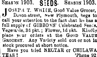JOSKP.-l T. WHITE, Good Value Grocer, Davonstreefc, New Plymouth, begg to call your at tent ion to the fact that ho has a foil supply i.f GIBBONS' Celebrated Seecs. Vegetable, 3d pkt.; Klower, Id pkt. Kindly place yi ur ordera at the Good Valub Sbooeby. Any Variety sold oat or not in stock procured at short notice. j Have jou tiled NKGTAB or OHILAWA jTEAS? 'Phone 92