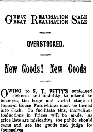 ► EALISATION CI ALE ALB OVERSTOCKED. Sew Ms! New floods \WING to E. T. PETTY'S continued J sickness and inability to attend tc business, the and varied stock of Into Cash. To facilitate this, marvellous Reductions in Prices will be made. An price lists are misleading the public should come and see the goods and judge fo> themselves.