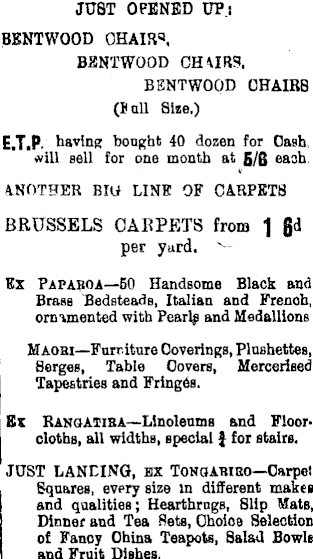 JUST OPENED UPi BENTWOOD OHAIR". BENTWOOD OH MRS, BENTWOOD OHAIBB (Hall Size.) E.T.P- having bought 40 dozen for Dash will sell for one month at 5/6 c&ch. ; A.NOTHER Blli LINK OF CARPETS BRUSSELS OABPETB from 1 fid i per yard. I ! Ex Papaboa—BO Handsome Black and Brass Bedsteads, Italian and French, ornamented with Pearls and Medallions Maori—Furniture Coverings, Plushettes, Serges, Table Covers, Mercerised Tapestries and Fringes. Ex BamoAliba—Linoleums and Floorcloths, all widths, special } for stairs. JUST LANCING, BX Tonoabibo—Carpet Squares, every size in different makes and qualities; Hearthrugs, Slip Mats, Dinner and Tea Bets, Ohoioe Selection of Fanoy China Teapots, Salad Bowie and Fruit Dishes.