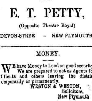 E. T. PETTY, (Opposite Theatre Royal) DEVON-BTBEE - NEW PLYMOUTH WE have Money to Lend on good aecnrity We are prepared to act as Agents fOl merits and others leaving the distric tmporarily or permanently. WESTON k WEBTON, ~- I Solicitorg, Wew Plymouth