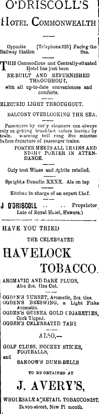 O'DRISCOLL'S. | Hotel Commonwealth Opposite [Telephone 225] Facirglbe Railway Station Sea. CHIS Commodious and Centrally-situated Hotel has jost been RE-BUILT AND REFURNISHED THKOUGHOUT, with all up-to-date conveniences and comforts. ELECTRIC LIGHT THROUGHOUT. i BALCONY OVERLOOKING THE SEA. Passengers by ear'y steamers can always rely on getting breakfast t.efore leaving by train. warning bell rung five minutes j btfoce departure of passenger trains. PORTER MEETS ALL XRJINS AND NIGHT PORTER IN ATTENDANCE. Only best Wines and Spirits retailed, Sptight.B Danedin XXXX, Ale on tap ' Kitchea in charge of an expert Chef. J O'DRISOOLL •• •• Proprietor, Late of Royal Hotel, Hawera.) HAVE YOU TRIED THE CELEBRATED RA.VELOCK TOBACCO. AROMATIC AND DARE PLUGS, Also 2oz. Tins Cut. OGDfN'S IURRET, Aromatic, 2oz. tins. OGDEN'S BBEBWING, a Light Flake Aromatic. OGDEN'S GUINEA GOLD CIGARETTES, Cork Tipped. OGDEN'S CELEBRATED TAB 3. 4LSO,— GOLF CLUBS, HOCKEY STICKS, FOOTBALLS, and SANfIOW'S DUMB-BELLS TO BB OBTAINED AT J. AVERY'S, WHOLESALE TOBAOCONIST, Dtvoa-street, New PI month.