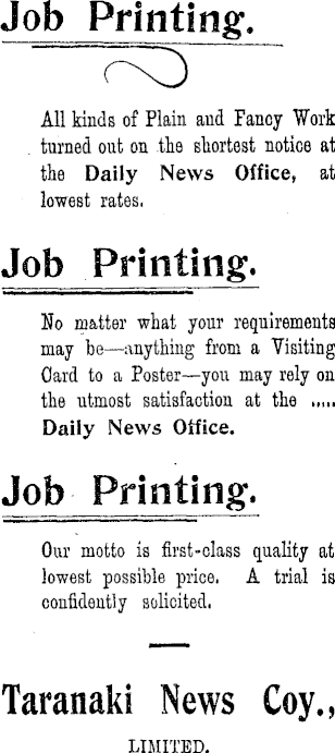 Job Printing. All kinds of Plain and Fanoy Work turned out on the shortest notice at the Daily News Office, at lowest rates, Job Printing. No matter what your requirements may be—anything from a Visiting Card to a Poster—you may rely on the utmost satisfaction at the ..,,. Daily News Office. Job Printing. Our motto is first-class quality at lowest possible price. A trial is confidently solicited, Taranaki News Coy.,