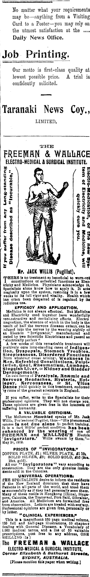 No matter what your requirements may be—anything from a Visiting Card to a Poster—you may rely on the utmost satisfaction at the ..,,. Daily News Office. Job Printing. Our motto is first-class quality at lowest possible price. A trial is confidently solicited, Taranaki News Coy., FREEMAN & WALLACE ELECTRO-MEDICAL 5 SURGICAL INSTITUTE. Mr. JACK WILLIS (Pugilist). " * ' nefiolal to worn-ont EFFICACY AND APPLICATION. Medicine is not always effeotual. But Medlolne «na Electricity used together hare wonderful* lOAstructive and revitalizing effects. Elec ignetism. the absenoe of which in the body is result of half the nervous diseases extant, can be Infused into the nerves by the wealing nightly ol in Electric " Invigorator," manufactured a: tested by two Scientiflo Electrloians and palled " electrically perfect" A few weeks of this remarkable treatment positively onre long-standing cases of IndiQes* Hon, Dyspepsia, Stomach Troubles, Sleeplessness, Disordered Functions (from whatever cause arising), Weakness in Men, Enfeebled Sonstltutlons, Palpi* tatiun. Gout, Rheumatism, Lumbago, Sluaaish Liver, or Kidney and Bladder Derangements. Cei tain forms of Paralysis, Anaemic and Nervous Headaches, Hysteria, Epl« lepsy. Nervousness, or St. Vitus Hance yield quickly to this treatment, endorsed > renin nf the evfiateat scientists In HnoUnd. Ii you suffer, write to the Bpeolallsts for tbelt ofessional opinions. They will not oharge yon. ring humanity. A VALUABLE CRITICIBM. ■mum illid, Professional Pug xesa Is not due It is a fact Willis' perfect condition has been enhanced by the wearing or ous ot PUEEMHN and WALLACE'S Electrii 'lnvlcjorators,' 'Willis swears by them."Uay 31,1903. PRICES OP "InVIQORATORS," COPPER PLATE, £1; SILVER PLATE, j6UOi SOLID SILVER, j6B; SOLID GOLD, 410 (801, 18ct. gold). All our " Invigorators" vary aooordlng to lonstruction. They are the only genuine initrsBents sold in tbe Colonies. UNIVERSAL OPERATIONSI THE SPECIALISTS desire to Inform the residents of the New Zealand dominion that they have Patients in all parts of the world, and treat them as successfully as if they had personally soan them. "CLINICAL EXPERIENCES," Mini BTT T-» i 1BTIVJ» BBTIM vii aT!I 1 V.V ? iff I 1.000 medical terms, and a list oi 60 Talusble prescriptions, post free to any address, ONB SHILLING (Is ) The FREEMAN & WALLACE ELECTRO-MEDICAL & SURGICAL INSTITUTE, Corner Elizabeth & Bathurat Stmtm, SYDNEY, AUSTRALIA. [Please mention this paper when wilting.]