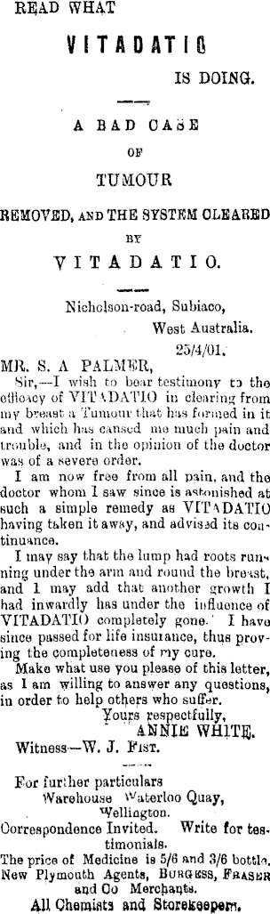 EUA.D WHAT VITADATIO A BAD OAoB REMOVED, AND THE SYSTKM OIiEABBD YITAD A 1 I 0. Nicholson-road, Subiaoo, West Australia. 25/4/01. MR. S. A PALMER, Sir, —I wish to bo;ir testimony t3 the efficacy of VITADATIO in clearing from my breast a Tumour that has formed in it arid which has cansud mo much pain and trouble, and in tho opinion of tlie doctor was of a severe order. I am now free from all pain, and tho doctor whom 1 saw since is astonished at such a simple remedy as VIT<\DATIO having taken it away, and advisad its continuance. I may say that the lump had roots run* ning under the arm and round the bretst, and 1 may add that another growth I had inwardly has under the influence of "VITADATIO completely gone.' I have since passed for life insurance, thus proving the completeness of ny cure. Make what use you please of this letter, as 1 am willing to answer any questions, in order to help others who suffer. Yours respectfully, " " ANNUS WHITS). Witness—W. J. Fist. For further particulars Warehouse Waterloo Quay, Wellington. Correspondence Invited. Write for testimonials. The price of Medicine is 5/6 and 3/6 bottle. New Plymouth Agents, Burgkss, Fhashjr and Oo Merchants. All Qhemiflta and Storetaepem.