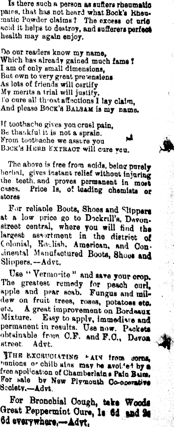Is there such a person at inftera rneumatio pains, that hag oot heard what Book's Khenmatic Powder claimb J The excess ot nrtO Hciit it helps to destroy, and sufferers perfect health ma; again enjoy. Ho our readers know my name. Which has already Rained much fame t I am of only Bmall dimensions, But own to very great pretention! As lota of friends will certify My merits a trial will justify. I'o cure all tluoataffnotions I lay claim, And please Bock's Balsam is my name. Tf toothache (rives yon cruel pain, Be thankful it is not a sprain. » Krom toothache we assure you Bjck'ij Hkrjj Kxteaot will cure you. Tho above is free from acids, beta? purely lierlml, gives instant relief without injuring the teeth, and proves permanent in most cases. Price Is, of leading chemists or stores For reliaole Boots, Shoes and at a low price go to Dicknll'g, Devonstreet central, where you will find the largest assortment in tho district of Colonial, Kn.Jish, Amerioan, and Oonuinent»l Manufactured Boots, Bhuos and Slippers.—Advt. Use " Vermo*ite " and save your crop. The greatest remedy for peach ourl, apple and pear scab. Fungus and mildew on fruit trees, roses, potatoes etc. eta. A great improvement on Bordeaux Mixture. E»sy to apply, immediv* and permanent in results. Use now. Packet* obtainable from O.P. and P. 0., Ddvoa street. Advt. IThb fcxosirotATiNo >■ jut from donuu or chilb ains may he avolW by ■ free spoliation of Chamberlain s Pain Bun, For sale by New Plymouth 00-oowatif* Scolety.—Advt. For Bronchial dough, ttka Wood* Great Peppermint Ours, 1| 6d Md Si «d w«ry wher,,-.Advt,