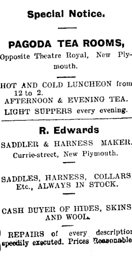 Special Notice. PAGODA TEA ROOMS, Opposite Theatre Royal, New Plymouth. HOT AND COLD LUNCHEON from 12 to 2. AFTERNOON & EVENING TEA. LIGHT SUPPERS every evening. R. Edwards SADDLER & HARNESS MAKER. Currie-street, New Plymouth. SADDLES, HARNESS, COLLARS, Etc., ALWAYS IN STOCK. CASH DUYER OF HIDES, SKINS, AND WOOL. ) REPAIRS of every descrlptio: speedily executed. Prices tteMnnable