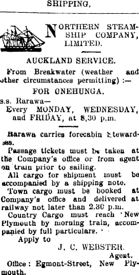 r ORTHERN STEAMi SHIP COMPANY, LIMITED. AUCKLAND SERVICE. From Breakwater (weather and ather circumstances permitting) : FOB ONEHUNUA. Every MONDAY, WEDNESDAY, and FRIDAY, at 8,30 p,m. Barawa carries (orecabin fctewardis. Passage tickets must b« taken at the Company's office or from agent on train prior to sailing. AH cargo (or Bbipment must be accompanied by a shipping note. Town cargo must be booked at Company's office and delivered at railway not later than 2.80 p.m. Country Cargo must reach 'New Plymouth by morning train, accompanied by full particulars. ' Apply to J. 0. WEBSTER. Agent. Office: Egraout-Street, New Plymouth.