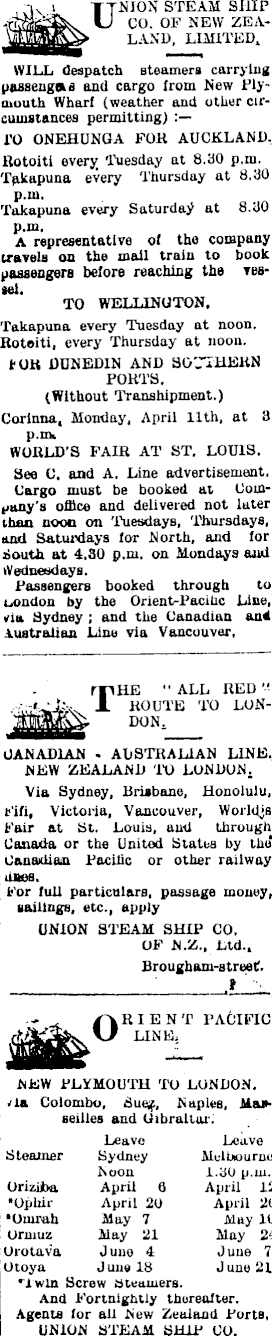 [NION STEAM SHIP J CO. OF NEW ZEA- ► LAND, LIMITED, WILL despatch Bteamers carrying passengas and cargo from Mew Flymouth Wharf (weather and other circumstances permitting) : I'O ONEHUNGA FOK AUCKLAND, Rotoiti every Tuesday at 8.30 p.m. Takapuna every Thursday at 8.30 p.m. Takapuna every Saturday at 8.30 J p.m. A representative of the company travels on the mail train to book j passengere before reaching the tbb•el. TO WELLINGTON. Takapuna every Tuesday at noon. Roteiti, every Thursday at noon. rOH DUNEDIN AND SOnHEKN PORTS. (Without Transhipment.) Corlnna, Monday, April 11th, at 3 p.m» WORLD'S FAIR AT ST. LOUIS. See C, and A. Line advertisement. Cargo must be booked at Company's office and delivered not later than noon on Tuesdays, Thursdays, and Saturdays for North, and for south at 4.30 p.m. on Mondays and Wednesdays. Passengers booked through to London by the Orient-Paciuc Line, tria Sydney; and the Canadian an* Australian Line via Vancouver, IHE " ALL RED " . ROUTE TO LONDON. CANADIAN . AUSTRALIAN LINE, NEW ZEALAND TO LONDON. Via Sydney, Brisbane, Honolulu, Kifi, Victoria, Vancouver, Worldjs Fair at St. Louis, and through Canada or the United Slates by the Canadian Pacilic or other railway ones. For full particulars, passage money, sailings, etc., apply UNION STEAM SHIP CO. OF N.Z., Ltd., Brougham-street. ORIENT PACIFIC LINE* NEW PLYMOUTH TO LONDON, /la Colombo, Sue?, Naples, ManOrizifca April 6 Apr •Opuir April 20 Ai "Oinrah May 7 J! nuz May 21 M Orotava Juno 4 Ji Otoya June 18 Ji *Twln Screw Steamers. And Fortnightly tnoreafte;