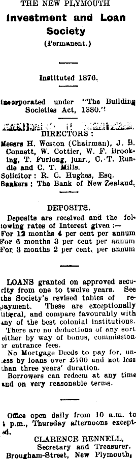 THE NEW PLYMOUTH Investment and Loan Society (Permanent.) Instituted 1876. lß»»rporated under "The Building Societies Act, 1380.'! I jZfaiHdZcj-<'' \l '.:*ia^lij a, '-'- i DIRECTORS: Ifessrs H. Weston (Chairman), J. B. Connett, W. Cottier, W. F. Brook- j Ing, T. Furlong, Junr., C-T. Bundle and C. T. Hills. | Solicitor: R. C. Hughes, Esq. , Bankers : The Bank of New Zealand.! DEPOSITS. | Deposits are received and the following rates of Interest given : For 13 months 4 per cent per annul Por 8 months 3 per cent per annun. For 3 months 2 per cent, per annum LOANS granted on approved security from one to twelve years. See the Society's revised tables of repayment. These are exceptionally libteral, and compare favourably with my of the best colonial institutions. There are no deductions o( any sort either by way of bonus, commission ir entrance fees. No Mortgage Deeds to pay for, un.ess by loans over £IOO and not less than three years' duration. Borrowers can redeem at any tima ind on very reasonable terms. Office open daily from 10 a.m. to I p.m., Thursday afternoons excepted. CLARENCE RENNELL, Secretary and Treasurer. Brougham-Street, New Plymouthi