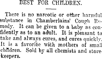 BEST FOR CHILDREN. There is no narcotic or oflher harmful substance in Chamberlains' Cou»li Remedy. It can be given to a baby "as confidently as to an ad"ult. It is pleasant to take and always cures, and cures quickly. It is a favorite with mothers of small children. Sold by all chemists and storekeepers.