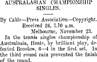 AUSTRALASIAN CHAMPIONSHIP SINGLES. By Cable—Press Association—Copyright. Received 24, 1.10 a.m. Melbourne, November 23. In the tennis singles championship of Australasia, Heats, by brilliant play, defeated Brookes, 6—4 in the first set. In the third round rain prevented the finish of the round.