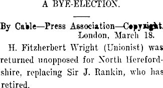 A BYE-ELECTION. By Cable—Press Association—Ctpy»ifkt. London, March 18. H. Fitzherbert Wright (Unionist) was returned unopposed for North Herefordshire, replacing Sir J. Rankin, who has retired.
