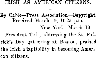 IRISH AS AMERICAN CITIZENS. By Cable—Press Association —o*pyrifkt. Received March 19, 10.25 p.m. New York, March 19. President Taft, addressing the St. Patrick's Day gathering at Boston, praised the Irish adaptibility in becoming American citizens.