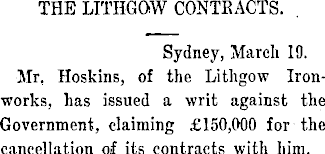THE LITHGOW CONTRACTS. . Sydney, March 19. Mr, Hoskins, of the Lithgow Ironworks, has issued a writ against the Government, claiming £150,000 for the cancellation of its contracts with him.