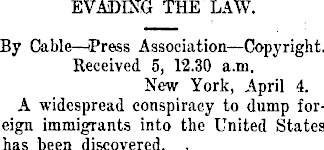 EVADING THE LAW. By Cable—Press Association—Copyright. Received 5, 12.30 a.m. New York, April 4. A widespread conspiracy to dump foreign immigrants into the United States has been discovered. .