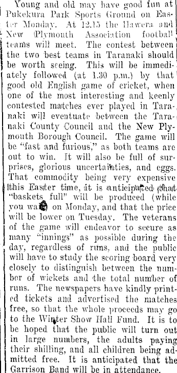 Young and old may have good fun at I Pukekura Park Sports Ground on Eas--Ist 'Monday. At lil,") the llawera. and ; Xew (Plymouth Association football [ | teams will meet. The contest between | the two best teams in Taranaki should Jbe worth seeing. This will be immediI ately followed (at 1.30 p.m.) by that good old English game of cricket, when one of the most interesting and keenly contested maitches ever played in Taranaki will eventuate between the Tara-i naki County Council and the New Plymouth Borough Council. The game will be "fast and furious," as both teams are out to win. It will also be full of surj prises, glorious uncertainties, and eggs. That commodity being very expensive! Itihis Easiter time, :it is lanticipufJed jtfhaiti "baskets full" will be produced (while! you wag on Monday, and that the price will be lower on Tuesday. The veterans of the game will endeavor to secure as many ''innings" as possible during the day, regardless of rims, and the public will have to study the scoring board very closely to distinguish between the number of wickets and the total number of runs. The newspapers have kindly printed tickets and advertised the matches free, so that the whole proceeds may go to the Winter Show Hall Fund. It is to be hoped that the public will turn out in large numbers, the adults paying their shilling, and all children being admitted free. It is anticipated that the Garrison Band will be in attendance.