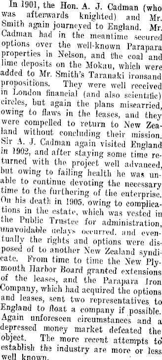 In 1901, the Hon. A. J. Cadman (who was afterwards knighted) and Mr. Smith again journeyed to England. Mr. Cadman had in the meantime secured options over the well-known Parapara properties in Nelson, and the coal and lime deposits on the Mokau, which were added to Mr. Smith's Taranaki ironsand propositions. They were well received in London financial (and also scientific) circles, but again the plans miscarried, owing to flaws in the leases, and they were compelled to return to New Zealand without concluding their mission. Sir A. J. Cadman again visited England in 1902, and after staying some time returned with the project well advanced but owing to failing health he was unable to continue devoting the necessary time to the furthering of the enterprise On his death in 1905, owing to complications in the estate, which was vested in the Public Trustee for administration, unavoidable delays occurred, and eventually the rights and options were disposed of to another New Zealand syndicate. From time to time the New' Plymouth Harbor Board granted extensions of the leases, and the Parapara Iron Company, which had acquired the options and leases, sent two representatives to England to float a company if possible. Again unforeseen circumstances and a depressed money market defeated the object. The more recent attempts to establish the industry are more or less well known.