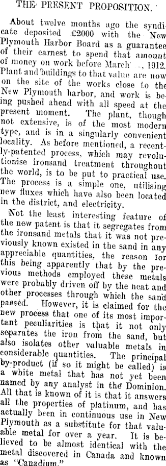 THE' PRESENT PROPOSITION. About twelve months ago the syndicate deposited £2OOO with the New Plymouth Harbor Board as a guarantee of their earnest to spend that amount ot money on work before March 1912 Plant-and buildings to that value are now on the site of the works close to the New Plymouth harbor, and work is bcing pushed ahead with all speed at the present moment. The plant, though not extensive, is of the most modern type, and is in a singularly convenient locality. As before mentioned, a recent-ly-patented process, which may revolutionise ironsand treatment throughout the world, is to be put to practical use, I lie process is a simple one, utilising new fluxes which have also been located in the district, and electricity. Not the least interesting feature of the new patent is that it segregates from the ironsand metals that it was not previously known existed in the sand in any appreciable (juantities, the reason for this being apparently that by the previous methods employed these metalswere probably driven off by the heat and other processes through which the sand passed. However, it is claimed for the new process that one of its most important peculiarities is that it not only separates the iron from the sand, but also isolates other valuable metals in considerable quantities. The principal by-product (if so it might be called) is a white metal that has not yet been named by any analyst in the Dominion. All that is known of it is that it answers all the properties of platinum, and has actually been in continuous use in New Plymouth as a substitute for that valuable metal for over a year. It is believed to be almost identical with the metal discovered in Canada and known as Canadium. w