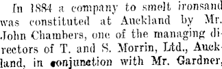 In 1884 a company to smelt ironsand was constituted at' Auckland by Mr. John Chambers, one of the managing directors of T. and S. Morrin, Ltd., Auckland, in «onjunatioi) with Mr. Gardner,