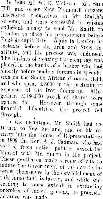 In 1896 Mr. W. D. Webster, Mr. Sam Hill, and other New Plymouth citizens interested themselves in Mr. Smith's scheme, and were successful in raising sufficient money .to send Mr. Smith to London to place his propositions before English capitalists. While in London he lectured before the Iron and Steel Institute, ami his process was endorsed. The busines of floating the company was placed in the hands of a broker who had shortly before made a fortune in speculation on the South African diamond field, and who spent £BOOO in the preliminary expenses of the. Iron Company. Altogether, £IBO,OOO worth of shares werc» applied for. However, through some financial difficulties, the project fell through. In the meantime. Mr. Smith had returned to New Zealand, and on his reentry into the House of Representatives in 1899 the Hon. A. J. Cadman, who had retired from active politics, associated himself with Mr. Smith in the project These gentlemen made strong efforts to induce the Government of the day to interest themselves in the establishment of this important industry, and while succeeding to some extent in extracting promises of encouragement, no practical advance was made.
