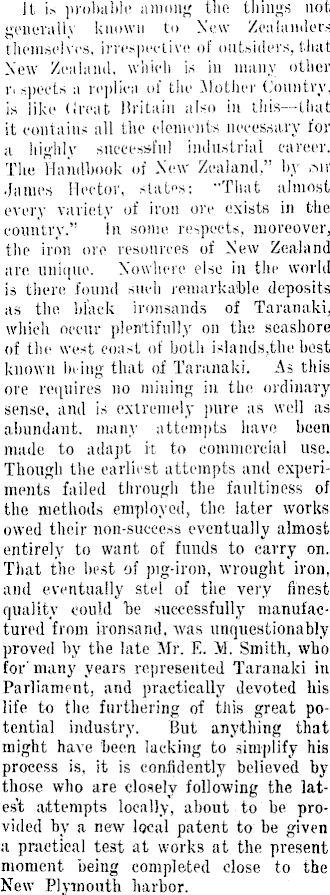 It is probable among the things not generally known to Xew Zea landers themselves, irrespective of outsiders, that Xew Zealand, which is in many other i-i spocts a replica of the Mother Country, is like (ireat Britain also in this—that it contains all the elements necessary for a highly successful industrial career. The Handbook of Xew Zealand," by >Mr James Hector, states: "That almost every variety of iron ore exists in the country." In some respects, moreover, the iron ore resources of New Zealand are unique. Xowhcre else in the world is there, found such remarkable deposits as the black ironsands of Taranaki, which occur plentifully on the seashore of the west coast of botli islands.the best known being that of Taranaki. As this ore requires no mining in the ordinary sense, and is extremely pure as well as abundant, many attempts have been made to adapt it to commercial use. Though the earliest attempts and experiments failed through the faultiness of the methods employed, the later works owed their non-success eventually almost entirely to want of funds to carry on. That the best of pig-iron, wrought iron, and eventually stel of the very finest quality could be successfully manufactured from ironsand, was unquestionably proved by the late Mr. E. M. Smith, who for' many years represented Taranaki in Parliament, and practically devoted his life to the furthering of this great potential industry. But anything that might have been lacking to simplify his process is, it is confidently believed by those who are closely following the lates't fiittempts locally, about to be provided by a new local patent to be given a practical test at works at the present moment being completed close to the New Plymouth harbor.