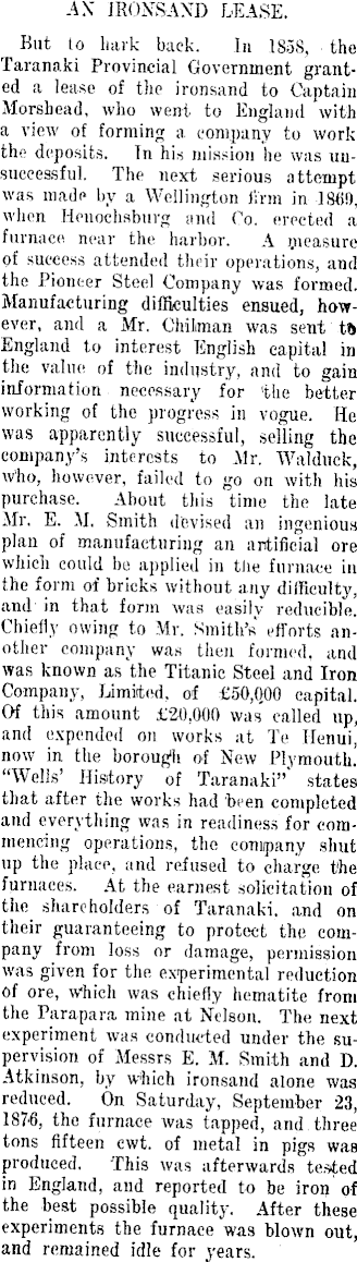 AS IRONSAND LEASE. But to hark back. In ISSS, the Taranaki Provincial Government granted a lease of the ironsand to Captain Morshead, who went to England with a view of forming a. company to work tho deposits. Tn his mission he was unsuccessful. The next serious attempt was made by a Wellington firm in ISfiO, when Honochsburg and Co. erected a furnace near the harbor. A pleasure of success attended their operations, and the Pioneer Steel Company was formed. Manufacturing difficulties ensued, however, and a Mr. Chilman was sent to England to interest English capital in the value of the industry, and to gain information necessary for 'the better working of the progress in vogue. He was apparently successful, selling the company's interests to Mr. Walduck, Who, however, failed to go on with his purchase. About this time the late Mr. E. M. Smith devised an ingenious plan of manufacturing an artificial ore which could be applied in the furnace in the form of bricks without any difficulty, and in that form was easily reducible. Chiefly owing to Mr. Smith's efforts another company was then formed, and was known as the Titanic Steel and Iron Company, Limiited, of £50,(>00 capital. Of this amount £20.000 was' called up, and expended oil works at Te Henui, now in the borough of New Plymouth. "Wells' History of Taranaki" states that after the works had been completed and everything was in readiness for commencing operations, the company shut up the place, and refused to charge t'he furnaces. At the earnest solicitation of the shareholders of Taranaki. and on their guaranteeing to protect the company from loss or damage, permission was given for the experimental reduction of ore, which was chiefly hematite from the Parapara mine at Nelson. The next experiment was conducted under the supervision of Messrs E. M. Smith and D. Atkinson, by which ironsand alone was reduced. On Saturday, September 23, 187-6, the furnace was tapped, and three tons fifteen cwt. of metal in pigs was produced. This was afterwards tested in England, and reported to be iron of the beat possible quality. After these experiments the furnace was blown out, and remained idle for years.