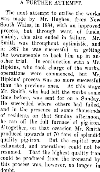 A FURTHER ATTEMPT. The next attempt to utilise the works was made by Mr. Hughes, from New South Wales, in 1884, with an improved process, but through want of funds, mainly, this also ended in failure. Mr. Smith was throughout optimistic, and in 1887 he was successful in getting the townspeople to back him up in another trial. In conjunction with a Mr. Hipkins, who took charge of the works, operations were commenced, but Mr. Hipkins' process was no more successful than the previous ones. At this stage Mr. Smith, who had left the works some time before, was sent for on a Sunday. He succeeded where others had failed, and in the presence of .some thousands of residents on that Sunday afternoon, he ran oif the full furnace of pig-iron. Altogether, on that occasion Mr. Smith produced upwards of 70 tons of splendid quality pig-iron. But the capital was exhausted, and operations could not be resumed. That the highest quality iron could be produced from the ironsand by this process was, however, no longer in doubt.