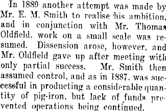 In 1880 another attempt was made by Mr. E. M. Smith to realise bis umbition, and in conjunction with Mr. Thomas Oldfield, work on a small scale was resumed. Dissension arose, however, and Mr. Oldfield gave up after meeting with only partial success. Mr. Smith then assumed control, and as in 1887, was successful in producing a considerable quantity of pig-iron, but lack of funds prevented operations being continued.