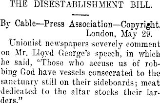 THE DISESTABLISHMENT BILL. By Cable—Press Association—Copyright. London, May 29. Unionist newspapers severely comment on Mr. Lloyd George's speech, in which he said, "Those who accuse us of robbing God have vessels consecrated to the sanctuary still on their sideboards; meat dedicated to the altar stocks their larders."