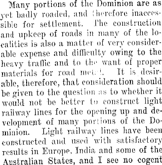 Many portions of the Dominion are as yet badly roaded, and Iherefore inaccessible for settlement, I'he construction and upkeep of roads in many of the localities is also a matter of very considerable expense and difficulty owing to the heavy traffic and to the want of proper materials for road met. !. It is desirable, therefore, that consideration should be given to the question as to whether it would not be better to construct light railway lines for the opening up and development of many portions of the Dominion. Light railway lines have been constructed and used with satisfactory results in Europe. India and some of the Australian States, and I see no cogent