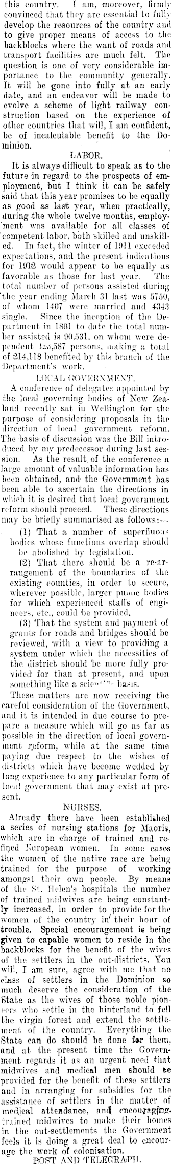 this country. I am, moreover, firmly convinced that they are essential to fully develop the resources of the country and to give proper means of access to the backblocks where the want of roads and j transport facilities are much felt. The : question is one of very considerable importance to the community generally. It will be gone into fully at an early date, and an endeavor will be made to evolve a scheme of light railway construction based on the experience of other countries that will, I am confident, be of incalculable benefit to the Dominion. LABOR. ! It is always difficult to speak as to the future in regard to the prospects of employment, but I think it can be safely said that this year promises to be equally as good as last year, when practically, during the whole twelve months, employment was available for all classes of [competent labor, both skilled and unskill- ' ed. In fact, the winter of 11)11 exceeded expectations, and the present indications for 1012 would appear to be equally as favorable as those for last year. The total number of persons assisted during 'the year ending March 31 last was f>7so, of whom 1407 were married and 434.'! single. Since the inception of the Department in 1891 to date the total number assisted is 00.531. on whom were dependent Lz-A,587 persons, .miking a total of 214,118 benefited by this branch of the Department's work. LOCAL GOVERNMENT. A conference of delegates appointed by the local governing bodies of New Zealand recently sat in Wellington for the purpose of considering proposals in the direction of local government reform. The basis' of discussion was the Bill introduced by my predecessor during last session. As the result of the conference a large amount of valuable information has been obtained, and the Government has been able to ascertain the directions in which it is desired that local government reform should proceed. These directions may be briefly summarised as follows: (1) 'That a number of superfiuoubodies whose functions overlap should be abolished by legislation. (2) That there should be a re-ar-rangement of the boundaries of the i existing counties, in order to secure, j wherever possible, larger nuuiic bodies for which experienced stall's of engineers, etc., could 'be provided. (3) That the system and payment of grants for roads and bridges should be reviewed, with a view to providing a system under which the necessities of 1 the district should "be more fully provided for than at present, and upon j something like a scic" 1 -'"- basis. ] These matters are now r receiving the | careful consideration of the Government, and it is intended in due course to prepare a measure which will go as far as possible in the direction of local government r.eform, while at the same time paying due respect to the wishes of districts which have become wedded by long experience to any particular form of local government that may exist at present. NURSES. Already there have been established a series of nursing stations for Maoris, which are in charge of trained and refined. European women. In some cases the women of the native race are being trained for the purpose of working amongst their own people. By means of the St. Helen's l hospitals the number of trained mid wives are being constantly increased, in order to provide for the women of the country in'their hour of trouble. Special encouragement is being 'given to capable women to reside in the backblocks for the benefit of the wives lof the settlers in the out-districts. You [will, I am sure, agree with me that no class of settlers in the Dominion so much deserve the consideration of the State as the wives of those noble pion-li-ers who settle in the hinterland to fell the virgin forest and extend the settlement of the country. Everything the j State can do should be done for them, and at the present time the Government regards it as an urgent need that midwives and medical men should fee provided for the benefit of these settlers and in arranging for subsidies for the assistance of settlers in the matter of medical attendance, audi rncoufaigfmg.. trained midwives to make their homes in the out-settlements the Government feels it is doing a great deal to encourage the work of colonisation. fPORT AND TELEGRAPH.