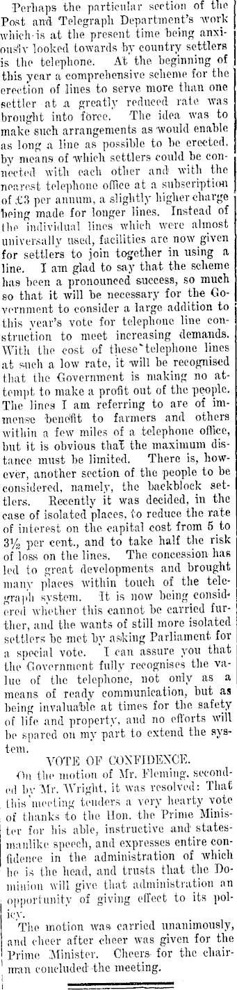 Perhaps the particular section of the Post and Telegraph Department's -work which is at the present time being anxiously looked towards by country settlers is the telephone. At the beginning of this year a comprehensive scheme for the erection of lines to serve more than one settler at a greatly reduced rate -was brought into force.' The idea was to make such arrangements as would enable as long a line as possible to be erected, by means of ■which settlers could he connected with each other and with the nearest telephone office at a subscription of £3 per annum, a slightly higher charge being made for longer lines. Instead of the individual lines which were almost universally used, facilities are now given for settlers to join together in using a line. lam glad to say that the scheme has been a pronounced success, so much so that it will be necessary for the Government to consider a large addition to this year's vote for telephone line construction to meet increasing demands. With the cost of these'telephone lines at such a low rate, it will he recognised that the Government is making no attempt to make a profit out of the people. The lines I am referring to are of immense 'benefit to farmers and others within a few miles of a telephone office, but it is obvious that the maximum distance must be limited. There is, how- ' ever, another section of the people to be considered, namely, the backblock settlers. Recently it was decided, in the case of isolated places, to reduce the rate of interest on the capital cost from 5 to 3% per cent., and to take half the risk of loss on the lines. The concession has led to great developments and brought many places within touch of the telegraph system. It is now being considered whether this cannot be carried further, and the wants of still more isolated settlers he met by asking Parliament for a special vote. I can assure you that the Government fully recognises the value of the telephone, not only as a means of ready communication, but as being invaluable at times for the safety of life and property, and no efforts will be spared on my part to extend the sys- ( tern. | VOTE OF CONFIDENCE. 1 On the motion of Mr. Fleming, secondi ed by Mr. Wright, it was resolved: That this'meeting tenders a very hearty vote of thanks to the Hon. the Prime Minister for his able, instructive and' statesmanlike speech, and expresses entire confidence in the administration of which he is the head, and trusts that the Dominion will give that administration an opportunity of giving effect to its policy. The motion was carried unanimously, and cheer after cheer was given for the Primes Minister. Cheers, for the chair- ' man concluded the meeting. I i ■ -