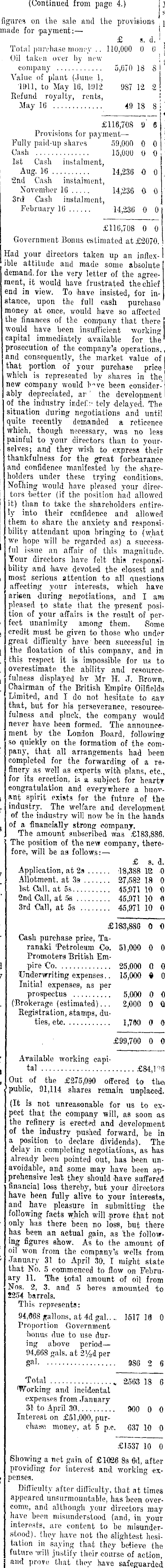 (Continued from page 4.) v I s figures on the sale and the provisions ; j; made for payment:— j £ s. d. ! Total pnrehase money .. 110,000 0 0 { Oil taken over by new j . company 5,070 18 8 Value of plant (June 1, •1911, to May 16, L-912 987 12 2 \ Refund royalty, rents, j May 10 '. 49 18 8j 1 £116,708 »' 6 f Provisions for payment— j Fully paid-up shares 59,000 0 0 ' Cash 15,000 0 0 ! Ist Cash instalment, Aug. 10 14,236 0 0 I 2nd Cash instalment, November 10 14,230 O 0 ' 3rd Cash instalment, February 10 14,236 0 0 £110,708 0 0 Government Bonus estimated at £2070.1 Had your directors taken up an inflexible attitude and made some absolute demand, for the very letter of the agreement, it would have frustrated the chief end in view. To have insisted, for instance, upon the full cash purchase money at once, would have so affected the finances of the company that there j would have been insufficient working capital immediately available for the' prosecution of the company's operations., and consequently, the market value of that portion of your purchase price which is represented by shares in the new company would h n ve been considerably depreciated, ar ' the development of the industry irdei'.v tely delayed. The situation during negotiations and until quite recently demanded a reticence which, though necessary, was no less painful to your directors than to yourselves; and they wish to express their thankfulness for the great forbearance and confidence manifested by the shareholders under these trying conditions. Nothing would have pleased your directors 'better (if the position had allowed it) than to take the shareholders entirely into their confidence and allowed them to share the anxiety and responsibility attendant upon bringing to (what we hope will be regarded as) a success- ■ ful issue an affair of this magnitude. Your directors have felt this responsibility and have devoted the closest and most serious attention to all questions affecting your interests, which have arisen during negotiations, and I am pleased to state that the present position of your affairs is the result of perfect unanimity among them. Some credit must be given to those who under great difficulty have been successful in the floatation of this company, and in this respect it is impossible for us to overestimate the ability and resourcefulness displayed by Mr H. J. Brown, Chairman of the British Empire Oilfields Limited, and I do not hesitate to say that, but for his perseverance, resourcefulness and pluck, the company would never have been formed. The announcement by the London Board, following so quickly on the formation of the company, that all arrangements had been completed for the forwarding of a refinery as well as experts with plans, etc., for its erection, is a subject for hearty congratulation and everywhere a buoyant spirit exists for the future of the industry. The welfare and development of the industry will now be in the hands of a financially strong company. The amount subscribed was "£183,886. The position of the new company, therefore, will be as follows: £ s. d. Application, at 2s 18,388 112 0 Allotment, at 3s- 27,682 19 0 Ist Call, at 5s 45,971 10 0 2nd Call, at 5a 45,971 10 fl 3rd Call, at 5s 45,971 10 0 £183,886 0 0 Cash purchase price, Taranaki 'Petroleum Co. 51,000 0 0 Promoters British Empire Co 25,000 0 0 Underwriting expenses.. 15,000 % 0 Initial expenses, as per prospectus 5,000 0 0 (Brokerage (estimated)... 2,000 0 fl Registration, stamps, duties, etc 1,790 0 0 £99,700 0 0 Available working capital £84,1 "B Out of the £275,090 offered to the, public, 91,114 shares remain unplaced. (It is not unreasonable for us to expect that the company will, as soon as the refinery is erected and development of the industry pushed forward, be in a position to declare dividends). The delay in completing negotiations, as has already been pointed out, has been unavoidable, and some may have been apprehensive lest they should have suffered financial loss thereby, but your directors have been fully alive to your interests, and have pleasure in submitting the following facts which will prove that not only has there been no loss, but there has been an actual gain, as 'the following figures show. As to the amount of oil won from the company's wells from January 31 to April 30, I might state that No. 5 commenced to flow on February 11. The total amount of oil from Nos. 2, 3. and 5 bores amounted to 2254 barrels. This represents: 94,668 gallons, at 4d ga1..., 1617 16 0 Proportion Government bonus due to use during above period—--94,668 gals, at 2M>dper gal 986 2 6 Total „ 2563 ig 6 Working and incidental expenses from January 31 to April 30 900 0 0 Interest on £51,000, purchase money, at 5 p.c. 637 10 0 £1537 10 0 Showing a net gain of £1026 8s 6d, after providing for interest and working expenses. Difficulty after difficulty, that at times appeared unsurmountaMe, has been overcome, and although your directors may have been misunderstood (and, in your interests, are content to be misunderstood), they have not the slightest hesitation in saying that they believe the future will justify their course of action, and prove that'they have safeguarded