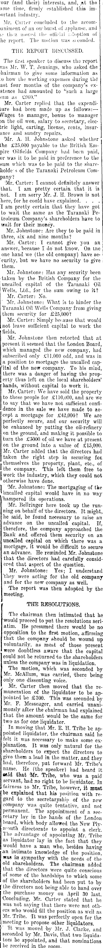 I'our (and their) interests, anil, at, tho s same time, firmly established 'this im- t invtant industry. i Mr. Cart it concluded to the accom- ' paniment of an oiuburst of applause, ami Ik 1 then moved the ollkhii :;.'.option of [he report. Tim motion was siconded. THE REPORT DISCUSSED. j The fir.-it speaker to discuss the report ' was Mr. W. T. Jennings, who asked (the ' chairman to give some information as to how the working expenses during tins last four months of the company's ex- ' istence had amounted to "such a large sum as CiKH)." Mr. Carter replied that the expenditure had been made up as follows: Wages to manager, bonus to manager on the oil won, salary to secretary, electric light, carting, license, rents, insurance and' sundry repairs. Mr. A. H. Johnstone asked whether the £25.000 payable to the British Empire Oilfields Company had been paid, or was it to be paid in preference to the sum which was to be paid to the share-holde-s of the Taranaki Petroleum Company? 'Mr. Carter: 1 cannot definitely answer that. I am pretty certain that it is hot. lam sorry Mr. J. H. Brown is not here, for he could have explained. . . . I am pretty certain that they have got to wait the same as the Taranaki Petroleum Company's shareholders have to ,wait for their money. Mr. Johnstone: Are they to be paid in three, six and nine months? Mr. Carter: I cannot give you an answer, 'because I do not know. On tiie one hand we (the old company) have security, but we have no security to give them. Mr. Johnstone: Has any security been taken by the British Company for the uncalled capital of the Taranaki Oil Wells, Ltd., for tho sum owing to it? Mr. Carter: No. Mr. Johnstone: What is to hinder the Taranaki Oil Wells Company from giving them security for £25,000"? Mr. Carter: Simply because that would not leave sufficient capital to work the fields. Mr. Johnstone then retorted that at present it seemed that the London Board, which managed the new company, had subscribed only £II,OOO odd, and was in a position to mortgage the uncalled capital of the new company. To his mind, there was a danger of having the property thus left on the local shareholders' hands, without capital to work it. Mr. Carter: We have sold the property to these people for £IIO,OOO, and are we to say that we have not sufficient confidence in the sale we have made to accept a mortgage for £42,000? We are perfectly secure, and our security will be enhanced by putting the oil-refinery on the ground, and making it possible to turn the £SOOO of oil we have at present on the ground into a value of £15,000. Mr. Carter ad'ded that the directors had taken the right step in securing for. themselves the proporty, plant, etc., of the company. This left them free to work the industry, which they could not otherwise have done. 'Mr. Johnstone: The mortgaging of tfee i uncalled capital would have in no way 'hampered its operations. Mr. Bellringer here took up the running on behalf of the directors. It might, he said, be found necessary to raise an advance on the uncalled capital. If, therefore, the company approached the Bank and offered them security on an uncalled capital on which there was a mortgage, it would be difficult to secure an advance. He reminded Mr. Johnstone that the directors had carefully considered that aspect of the question. Mr. Johnstone: Yes; I understand 'they were acting for the old company and for the new company as well. The report was then adopted by the meeting. THE RESOLUTIONS. The chairman then intimated that he | would proceed to put the resolutions seriatim. He presumed there would be no opposition to the first motion, affirming that the company should be wound up voluntarily, as most of those present were doubtless aware that the capital could not be returned to the shareholders unless the company was in liquidation. The motion, which was seconded by Mr. McAllum, was carried, there being only one dissenting voice. Mr. Carter then moved that the remuneration of the liquidator to be appointed be £3OO. This was seconded by Mr. F. Messenger, and carried unanimously after the chairman had explained that the amount would be the same for two as for one liquidator. In moving that Mr. E. H. Tribe be appointed liquidator, the chairman said he felt it was necessary to make some explanation. It was only natural for the . shareholders to expect the directors to give them a lead in the matter, and .they had, therefore, put forward Mr. Tribe's name. He (the speaker) had heard it eftid that Mr. Tribe, who was a paid servant, had no right to be liquidator. In fairness to Mr. Tribe, however, it must be explained that his position with regard to the secretaryship of the new company was quite tentative, and not permanent. The appointment of a secretary lay in the hands of the London board, which body allowed the New Plymouth directorate to appoint a clerk. The advantage of appointing Mr. Tribe as liquidator lay in the fact that they would have a man who, besides having an intimate knowledge of the position, was in sympathy with the needs of the old shareholders. The chairman added that the directors were quite conscious of some of the hardships to which some of the shareholders had been put to by \ the directors not being able to hand over the purchase money on April 30 last. I Concluding, Mr. Carter stated that he was not saying that there were not others who would fill the position as well as Mr. Tribe. 'lt was perfectly open for the I meeting to propose other liquidators. 5' 'lt was moved by Mr. J. Clarke, and seconded by Mr. Davis, that two liquidators be appointed, and that nominations be received in the room.
