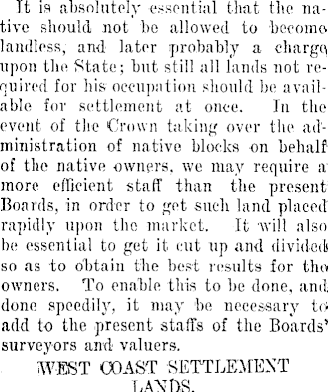 it is absolutely essential that the native should not be allowed to become, landless, and later probably a charge, upon the State; but still all lands not required for his occupation should be available for settlement at once. In the event of the Crown taking over the administration of native blocks on behalf of tlie native owners, we may require a more efficient staff than the present Boards, in order to get such land placed rapidly upon the market. It will also be essential to get it cut up and divided so as to ohtain the best results for tho owners. To enable this to be done, and. done speedily, it may be necessary to add to the present staffs of the Boards' surveyors and valuers. WEST COAST SETTLEMENT LANDS.