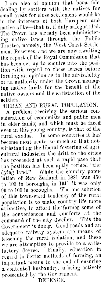 I am also of opinion that bona fide dealing by settlers with the natives fof small areas for close settlement would be in the interests of both European and' native alike—that is, if duly safeguarded. The Crown has already been administering native lands through the Public Trustee, namely, the West Coast Settlement Reserves, and we are now awaiting the report of the Royal Commission that has been set up to enquire into the position with regard to these leases before forming an opinion as to the advisability of aa authority under the Crown managing native lands for the benefit of the native owners and the satisfaction of the settlers. URBAN AND RURAL POPULATION. A problem receiving the serious consideration of economists and public men in older lands, and which must be faced' even in this young country, is that of the rural exodus. In some countries it has' become most acute, so much so that notwithstanding the liberal fostering of agricultural industries the drift to the cities has proceeded at such a rapid pace that' the position has been aptly termed "the dying land." While the country population of New Zealand in LBBJ. was 150 to 100 in boroughs, in lftll it was only 99 to 100 in boroughs. The one solution of this town-ward tendency of the rural population is to make country life more attractive, to afford the" farmer some of the conveniences and comforts at the command) of the city dweller. This the Government is> doing. Good roads and an adequate railway system are means of lessening the rural isolation, and these we are attempting to provide to a satis- ' factory degree. Finally, education in regard to better methods of farming, an important means to the end of ensuring a contented husbandry, is being actively prosecuted by the Government. DEFENCE.