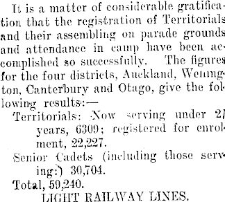 It is a matter of considerable gratification that the registration of Territorials and their assembling on parade grounds and attendance in camp have been accomplished so successfully. The figures for the four districts, Auckland, Wellington, Canterbury and Otago, give the following results 1 : — Territorials: Now serving under 2J years, 0309; registered for enrolment, 22,227. Senior Cadets (including those serving!) 30,704. Total, 59,240. LIGHT RAILWAY LINES.