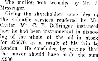 The motion was seconded by Mr. V. Messenger. Giving the shareholders some idea of the valuable services rendered by Mr. Carter, Mr. C. E. Bellringer instanced bow lie had been instrumental in disposing of the whole of the oil in stock for £5670. as a result of his trip to London. He concluded by stating that the mover should have made the sum £SOO.