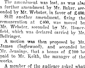 The amendment was lost, ns was also a further amendment by Mr. Baker, seconded by Mr. Webster, in favor of £4OO. Still another amendment, fixing the remuneration at £4OO, was moved by Mr. Webster, seconded by Mr. ll'onevfield. which was declared carried by Mr. Bellringer. A motion was then proposed by Mr. James (Inglewood), and seconded hv Mr. Jennings, that a bonus of £IOO be paid to Mr, Keith, the manager of the works. A member of the audience asked what