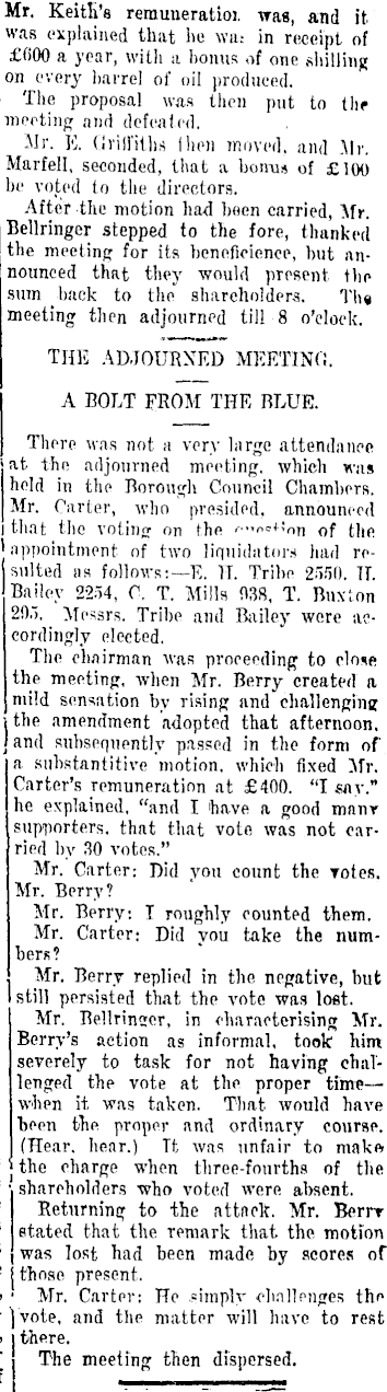 Mr. Keith's rerauneratioi. was, and it was explained that lie was in receipt of £fiOO a year, with a bonus of one shilling on every barrel of oil produced. The proposal was then put to the meeting and defeated. Air. E. (ivili'itlis I lien moved, and Mr. Marfell, seconded, that a bonus of £IOO be voted to the directors. After the motion had been carried, Mr. Bellringer stepped to the fore, thanked the meeting for its bennfieience, but announced that they would present the sum back to the shareholders. The meeting then adjourned till 8 o'clock. THE ADJOURNED MEETING. A BOLT FROAT THE BLUE. There was not a very large attendance at the adjourned meeting, which was held in the Borough Council Chambers. Mr. Carter, who presided, announced I that the voting on the «-"n=Hnn of the | appointment of two liquidator* had resulted as follows:—E. H. Tribe 2550. IT. Bailey 2254, C. T. Mills 038, T. Buxton 2f15. Messrs. Tribe and Bailey were accordingly elected. The chairman was proceeding to close the meeting, when Mr. Berry created a mild sensation by rising and challenging the amendment adopted that afternoon, and subsequently passed in the form of a substantitive motion, which fixed Afr. Carter's remuneration at £4OO. "I say." he explained, "and I have a good many supporters, that that vote was not carried by 30 votes." Mr. Carter: Did vou count the Totes. Mr. Berry? Air. Berry: T roughly counted them. Mr. Carter: Did vou take the numbers? Air. Berry replied in the negative, but still persisted that the vote was lost. Mr. Rellrinaer, in characterising Mr. Berry's action as informal, took him severely to task for not having challenged the vote at the proper time—when it was taken. That would have been the proper and ordinary course. (Hear, hear.) Tt was unfair to maker the charge when three-fourths of the shareholders who voted were absent. Returning to the attack. Mr. Berrr stated that the remark that the motion was lost had been made by scores of those present. Mr. Carter: He simply challenges the vote, and the matter will have to rest there. The meeting then dispersed.