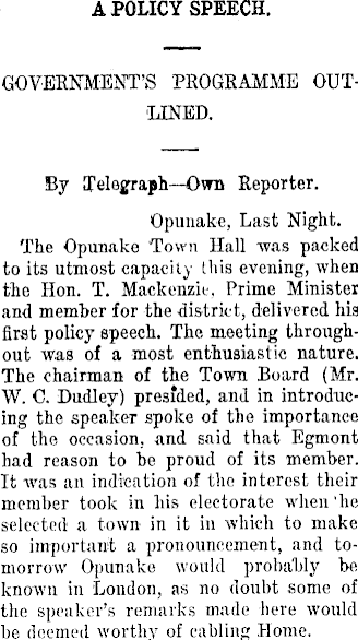 A POLICY SPEECH. GOVERNMENT'S PROGRAMME OUTLINED. By [Telegraph— Own Reporter. Opunake, Last Night. The Opunake Town Hall •was packed to its utmost capacity this evening, when the Hon. T. Mackenzie, Prime Minister and member for the district, delivered his first policy speech. The meeting throughout was of a most enthusiastic nature. The chairman of the Town Board (Mr. W. C. Dudley) presided, and in introducing the speaker spoke of the importance of the occasion, and said that Egmont had reason to be proud of its member. It was an indication of the interest their member took in his electorate when'he selected a town in it in which to make so important a pronouncement, and tomorrow Opunake would probably be known in London, as no doubt some of the speaker's remarks made here would be deemed worthy of cabling Home.