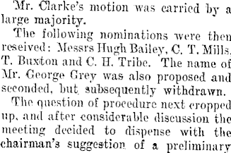 'Mr. Clarke's motion was carried by a large majority. The following nominations were then reseived: Messrs Hugh Bailey, C. T.Mills, T. Buxton and C. H. Tribe. The name of Mr. George Grey was also proposed and seconded, hut. subsequently withdrawn. The question of procedure next cropped up, and after considerable discussion the meeting decided to dispense with the chairman's suggestion of a preliminary