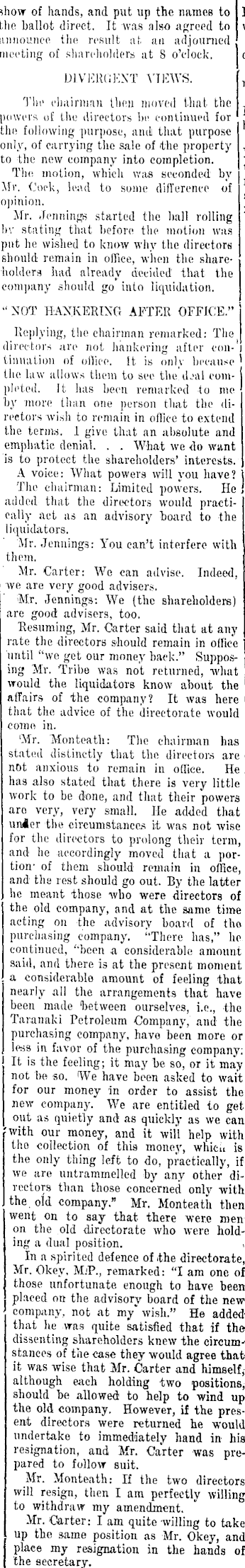 show of hands, and put up the names to the ballot direct. It was also agreed to announce the result at. an adjourned meeting of shareholders at 8 o'clock. DIVERGENT VIEWS. The chairman then moved that the powers of the directors be continued for the following purpose, anil that purpose only, of carrying the sale of the property to the new company into completion. The motion, which was seconded by Mr. Cock, lead to some difference of opinion. Mr. Jennings started the hall rolling bv stating that before the motion was put he wished to know why the directors should remain in office, when the shareholders had already decided that the company should go into liquidation. " NOT HANKERING AFTER OFFICE." Replying, the chairman remarked: The directors are not hankering after con-' tinuation of office. It is only because the law allows them to see the. d_>al completed. It has been remarked to me by more than one person that the directors wish to remain in office to extend the terms. 1 give that an absolute and emphatic denial. . . What we do want is to protect the shareholders' interests. A voice: What powers will you have? The chairman: Limited powers. He added that the directors would practically act as an advisory board to the liquidators. Mr. Jennings: You can't interfere with them. Mr. Carter: We can advise. Indeed, we are very good advisers. Mr. Jennings: We (the shareholders) are good advisers, too. Resuming, Mr. Carter said that at any rate the directors should remain in office until "we get our money back." Supposing Mr. Tribe was not returned, what would the liquidators know about the affairs of the company? It was here that the advice of the directorate would come in. 'Mr. Monteath: The chairman has I stated distinctly that the directors are \ not anxious to remain in office. He ,' has also stated that there is very little work to be done, and that their powers are very, very small. He added that under the circumstances it was not wise for the directors to prolong their term, and he accordingly moved that a por-1 tion- of them should remain in office, and the rest should go out. By the latter he meant those who were directors of the old company, and at the same time acting on the advisory board of tho purchasing company. "There has," he , continued, "been a considerable amount said, and there is at the present moment ' a considerable amount of feeling that nearly all the arrangements that have been made between ourselves, i.e., the Taranaki Petroleum Company, and the purchasing company, have been more or less in favor of the purchasing company: It is the feeling; it may be so, or it may not be so. We have been asked to wait for our money in order to assist the new company. We are entitled to get out as quietly and as quickly as we can : with our money, and it will help with tho collection of this money, whicii is the only thing left to do, practically, if we are untrammelled by any other directors than those concerned only with the. old company." Mr. Monteath then went on to say that there were men on the old directorate who were holding a dual position. In a spirited defence of the directorate, Mr. Okey, M.'P., remarked: "I am one of t those unfortunate enough to have been placed on the advisory board of the new company, not at my* wish." He added' that lie was quite satisfied that if the dissenting shareholders knew the circum- • stances of the case they would agree that it was wise that Mr. Carter and himself, although each holding two positions, should be allowed; to help to wind up. the old company. However, if the present directors were returned he would undertake to immediately hand in his resignation, and Mr. Carter was prepared to follow suit. ! Mr. Monteath: If the two directors will resign, then I am perfectly willing to withdraw my amendment. Mr. Carter: I am quite wiling to take up the same position as Mr. Okey, and place my resignation in the hands of the secretary.